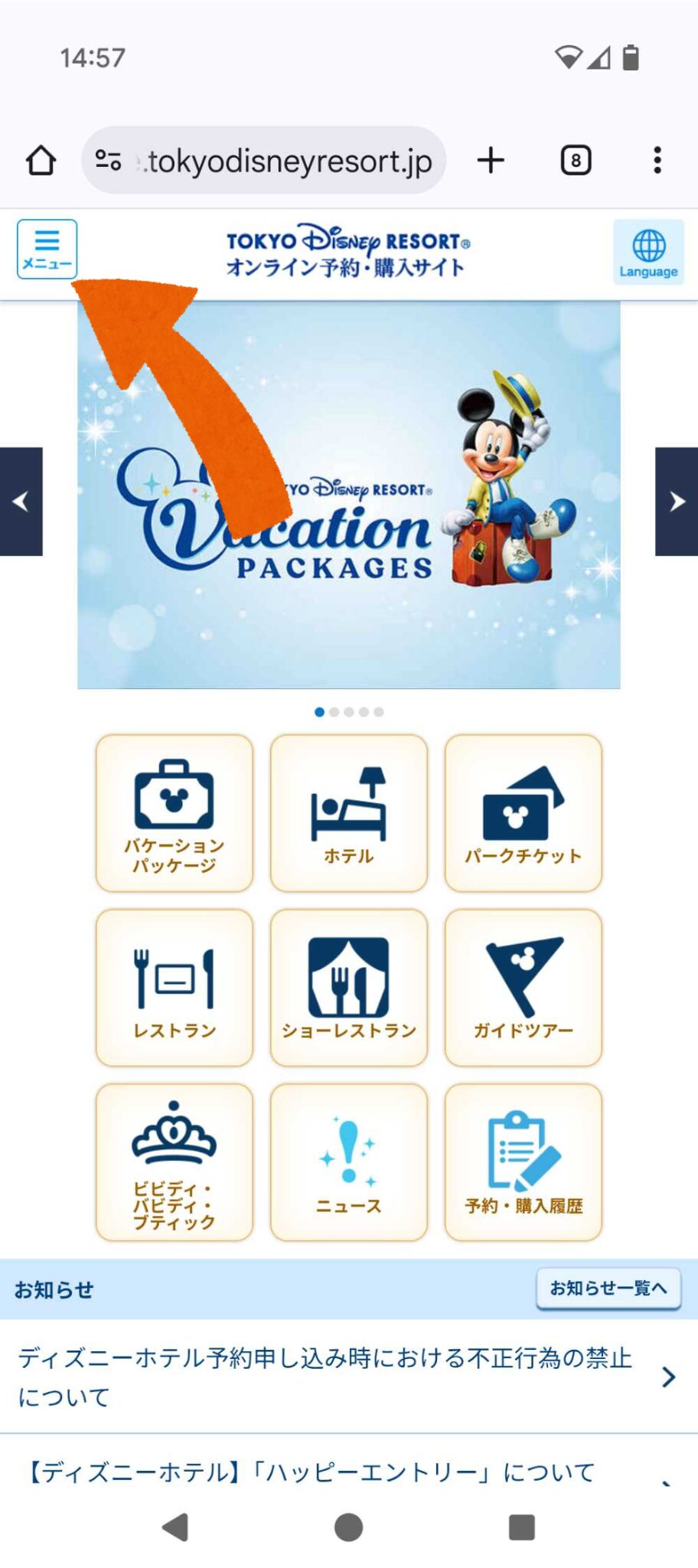 ①公式の「オンライン予約・購入サイト」の左上「メニュー」を開く